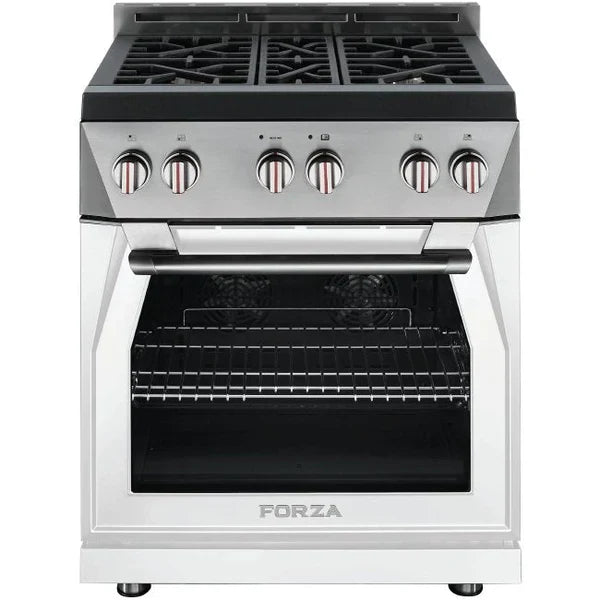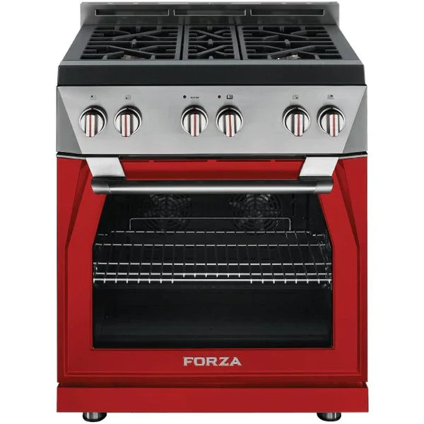 The Forza 30 inch all gas range model offers a unique Italian radical design and outstanding performance through: 4 high efficient full brass burner, Infinito™ Grate System, Massimo Blu™ Double Broiler System and the industry’s widest oven capacity compatible with a commercial sized tray. It is available in six color options. Perfect from primipiatti to dessert. Available at Home Outlet Direct.
