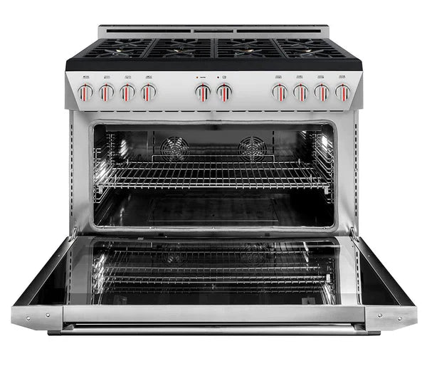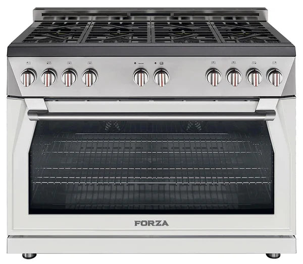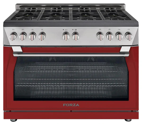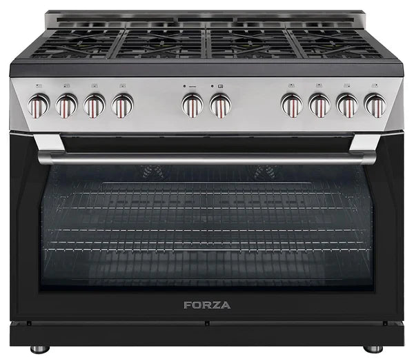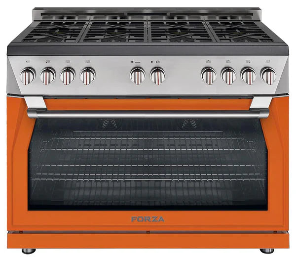 The Forza 48-inch Professional Gas Range is the world’s first 48-inch single cavity oven. Spanning 40-inches wide, it is radically designed with 8 high-powered burners including four dual-flame burners that range from 685 BTU to 20,000 BTU and four from 2,200 to 12,000 BTU burners. Equipped with Forza’s proprietary Massimo Blu™ Hyper Double Broiler, Max Rotisserie accessory and the Infinito™ Grate System, this range is a dynamic force for any kitchen and elevates the cooking experience. Available at home outlet direct.